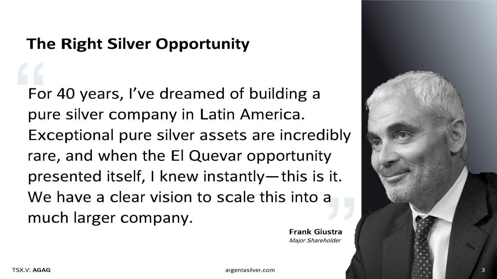 On August 12, 2025 Argenta Silver announced that it had raised CND $15 million at a price of C$0.40 per unit. Pursuant to the offering, Frank Giustra acquired 450,000 common shares and 225,000 Warrants.
