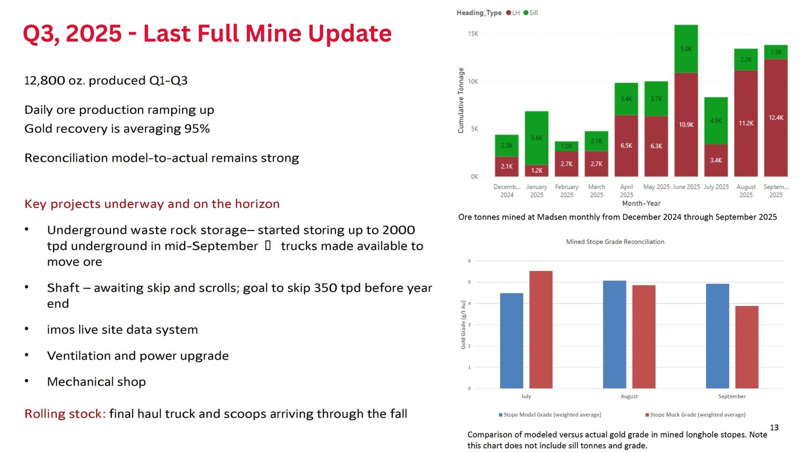 “We have worked diligently through the stages and challenges of mine ramp up, always focused on getting the Madsen Mine into full-scale operations early in 2026, and we are now in sight of that goal,” stated Shane Williams, President and CEO.